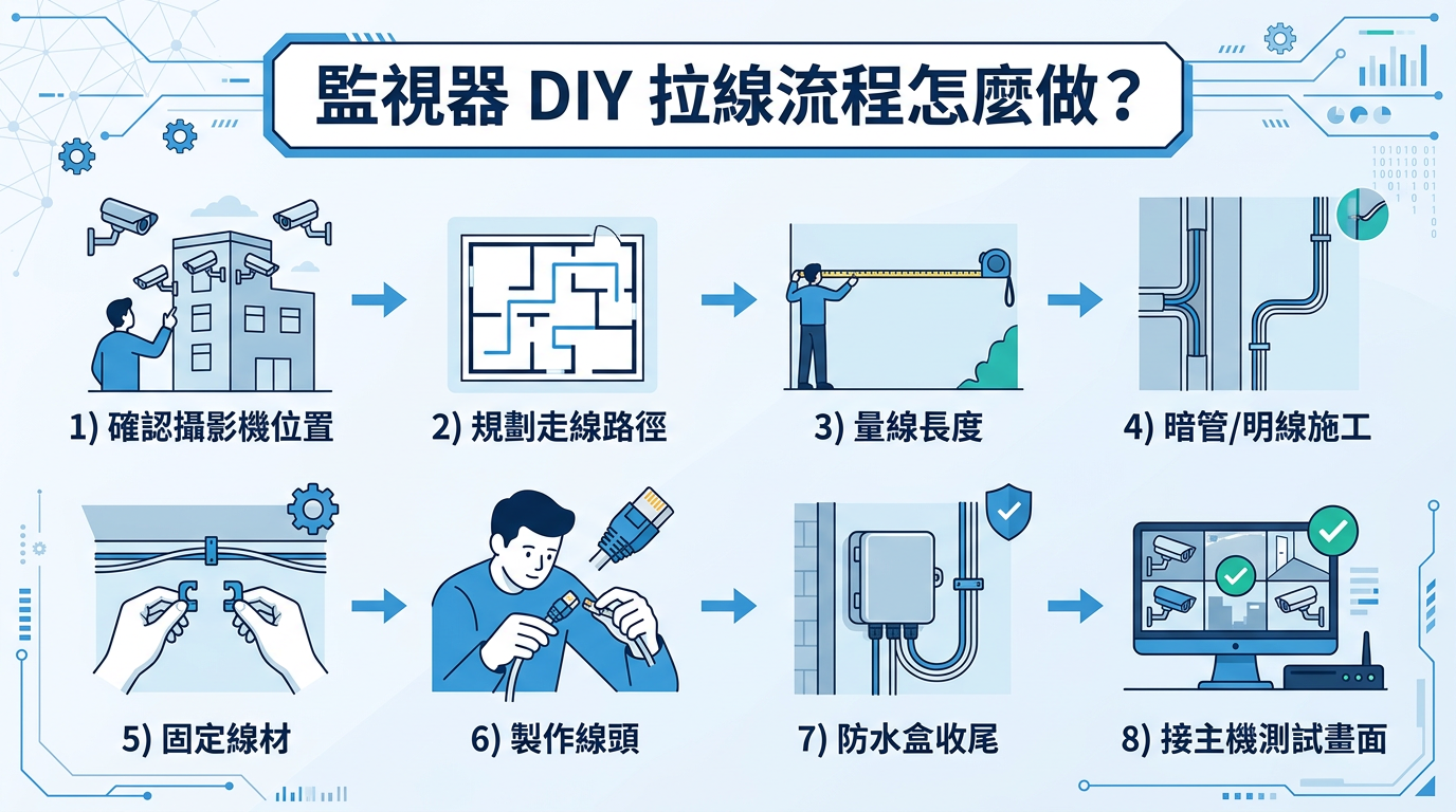 其實監視器 DIY 拉線真的沒有很多人想像中那麼困難,只要前期把工具準備好、現場路徑規劃清楚,施工時按照步驟慢慢做,大多數基本的住家或小型店面監視器系統,都是有機會自己完成的。上一篇介紹的是施工前準備,這一篇分享的是實際拉線步驟,兩篇搭配起來看,會更容易建立完整概念。