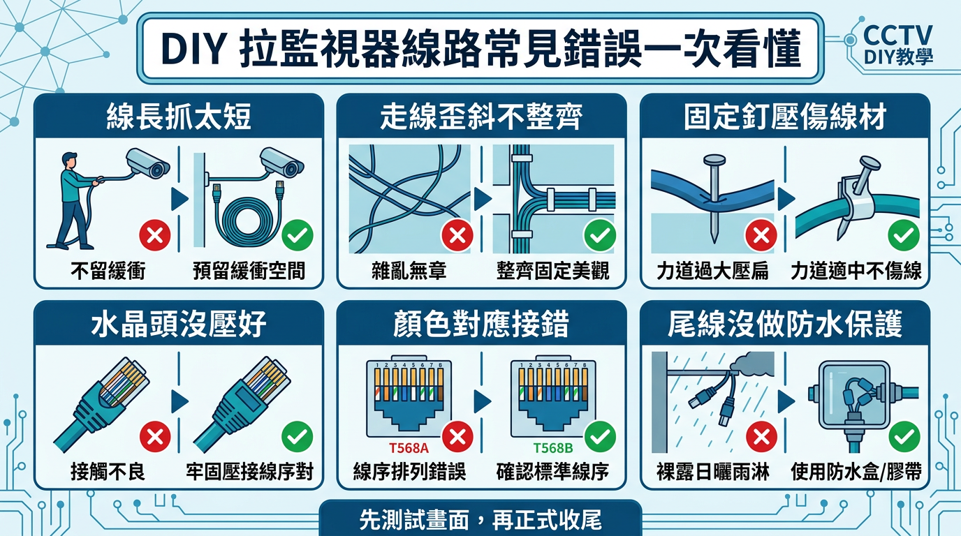 自己 DIY 拉監視器線路時,最常見的錯誤通常有幾種。第一種就是線材沒有預留長度,結果最後差一點點,主機端或攝影機端很難接。第二種是顏色沒有對好,尤其是類比監視器搭配絞線傳輸器時,只要主機端和攝影機端顏色對應錯了,畫面就不會正常。第三種是水晶頭沒壓到底或八芯沒剪齊,造成網路線看起來做好了,實際卻不通。 Source Source