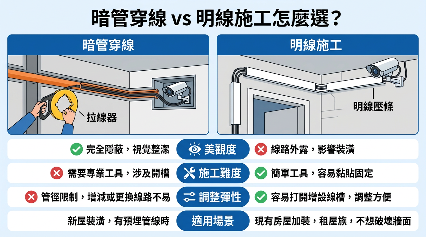 正式拉線前,第一件事不是拿起電鑽,而是先判斷現場適合用哪一種佈線方式。一般來說,監視器線路常見有兩種施工方式,一種是 暗管穿線,另一種是 明線施作。如果建物原本就有預留管路,那暗管穿線當然是最美觀也最耐用的做法;但如果現場沒有預留管路,那就只能採用壓條或固定釘做明線施作。