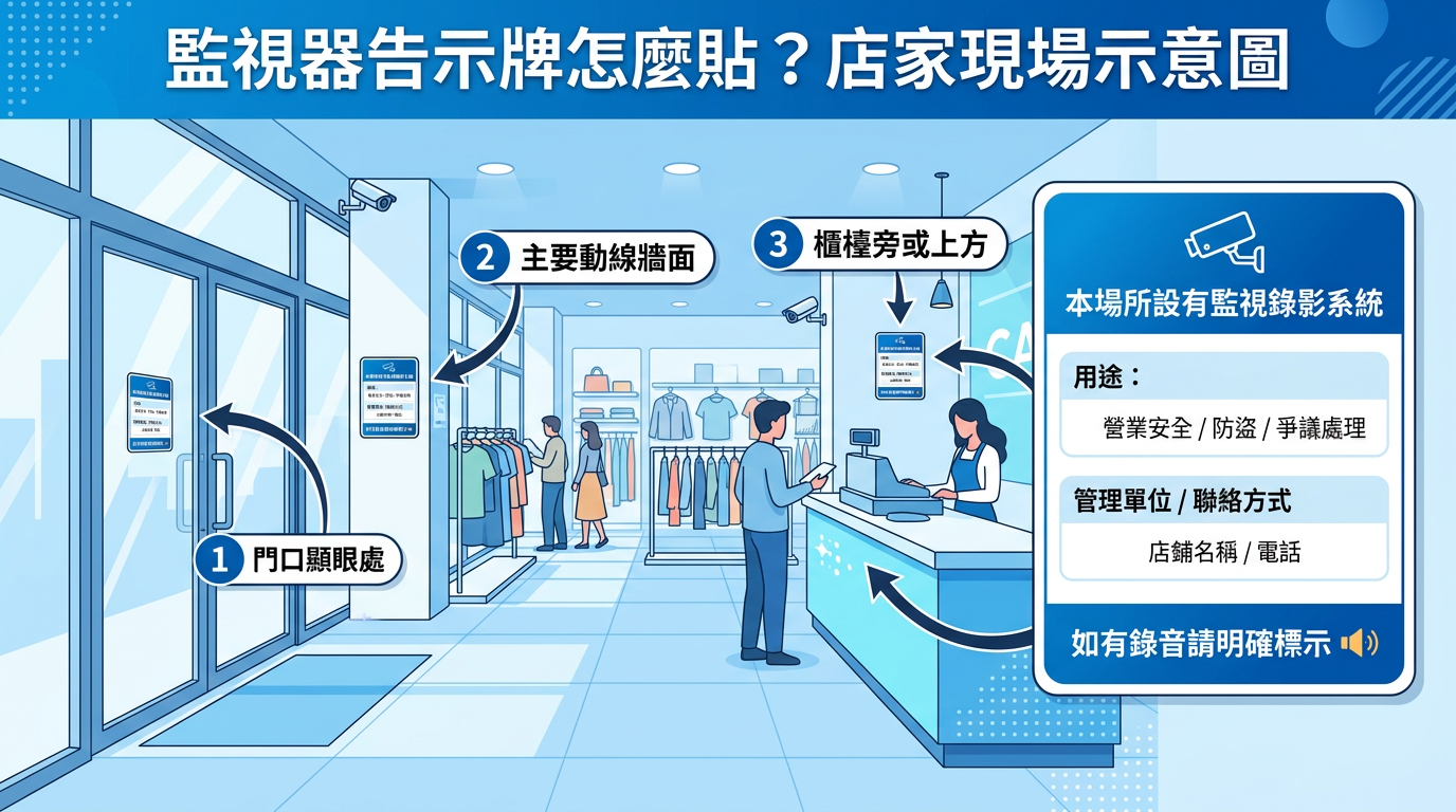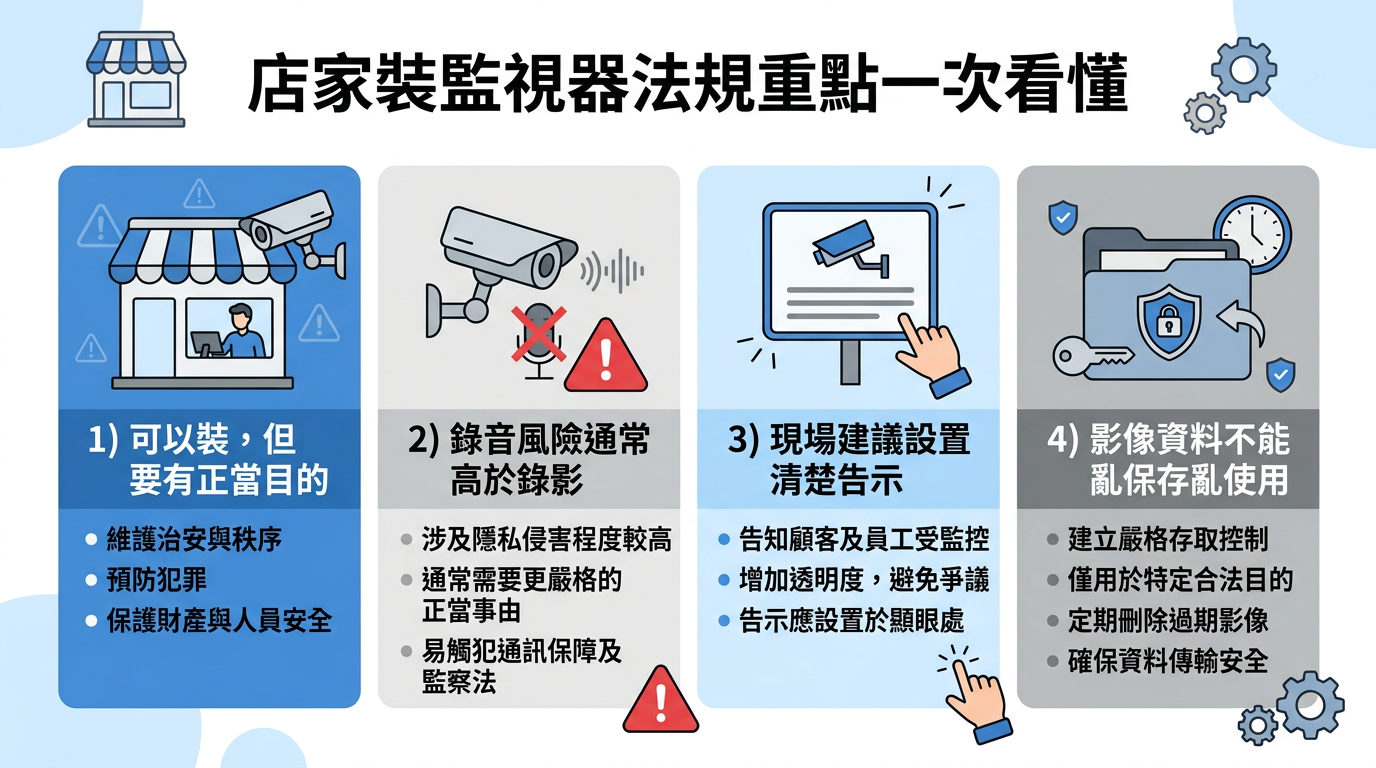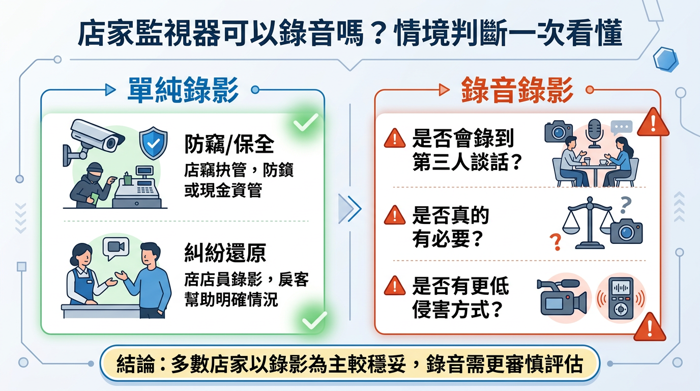 提醒: 上面內容屬一般法規觀念整理,實際個案仍可能因行業別、安裝位置、錄音方式與使用目的不同而有差異;若店面情況較特殊,仍建議進一步向專業法律人士確認。