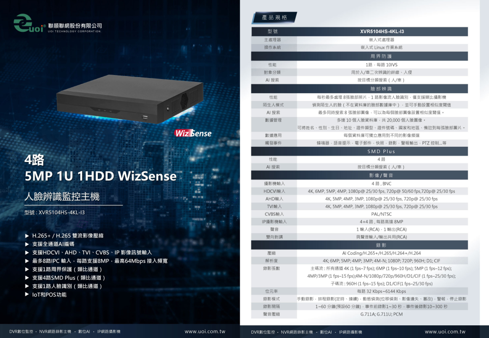 Dahua 大華監視器 4路800萬畫素XVR 【 監視主機 】 中性紙盒包裝 主機外觀如封面圖 台灣總代理貨 維修保固有保障 APP:DMSS 本商品不含硬碟,如需要硬碟請至賣場另外選購 如需錄影,一定需要加裝硬碟 商品含稅 【如需統編請備註】 H.265+ / H.265 雙流影像壓縮 支援全通道AI編碼 支援HDCVI、AHD、TVI、CVBS、IP 影像訊號輸入 最多8路IPC 輸入,每路支援8MP,最高64Mbps 接入頻寬 支援1路周界保護(類比通道) 支援4路SMD Plus(類比通道) 支援1路人臉識別(類比通道) IoT和POS功能 單硬碟(最大支援10TB)