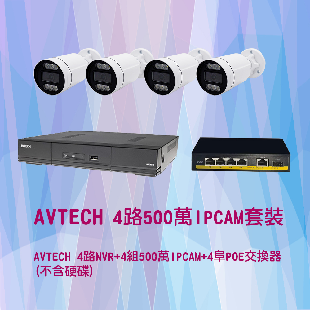 AVTECH 500萬IPCAM四路套裝(套裝內容 4組500萬畫素IPCAM+AVTECH 4路DGH1103BX(US)-U1 4K NVR+4阜 POE交換器)